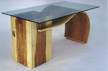 | Eckbank, Tischgestell und Stühle aus massiver Fichte, Tischplatte aus 65mm Ahorn, nach den Verleimregeln verleimt und durch Gratleisten zusätzlich vor dem Verziehen gesichert. | Esszimmertisch aus massiver Erle mit stirnseitiger dekorativer Ausbuchtung für den "Chef" des Hauses. Um ein Verziehen der Tischplatte zu vermeiden wurde hier auch wieder mit Gratleisten gearbeitet, zusätzlich und aus optischen Gründen wurde eine Ahornmittellage, die an den Kanten sichtbar ist zwischen die Erleplatten geleimt. | ||||