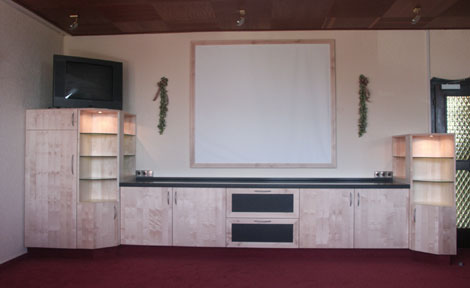 und Seminarraum des Höhenhauses Neunkirchen. Einen schönen Kontrast zu dem hellen Ahornholz bildet die dunkle Arbeitsplatte und die Schubkastenfüllungen aus Mineralwerkstoff. In die Arbeitsplatte wurde eine Saftrille eingefräst, damit nichts auslaufen kann. Die hintere Aufkantung ist durch eine Hohlkehle nahtlos mit der Platte verbunden, wodurch alles "wie aus einem Guß" aussieht. |